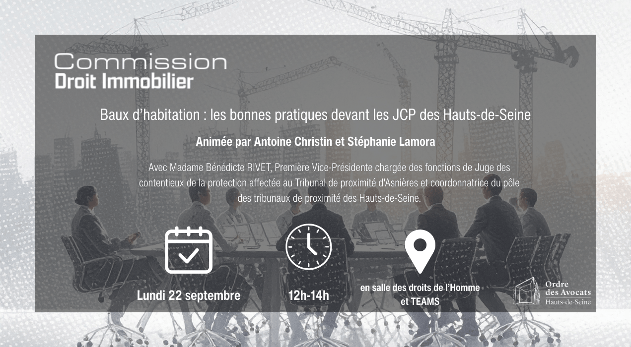 La Commission Droit Immobilier se réunie le lundi 22 septembre 2025 de 12h00 à 14h00 en salle des Droits de l'Homme.