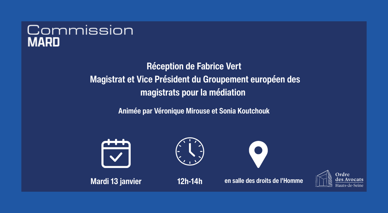La commission MARD se réunit le mardi 13 janvier 2026 de 12h à 14h en salle des droits de l'Homme et recevra Fabien Vert, Magistrat et Vice Président du Groupement européen des magistrats pour la médiation.